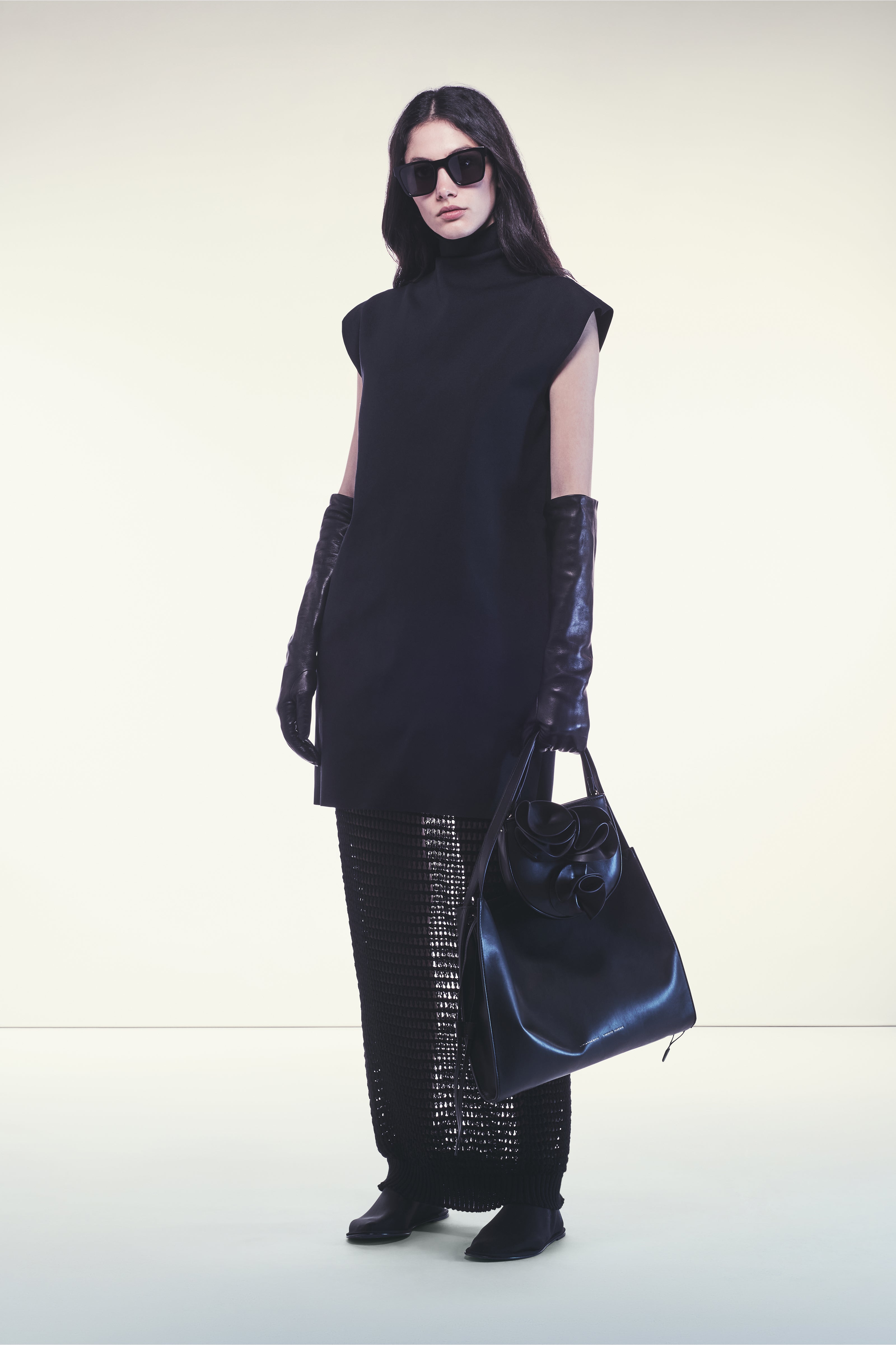 ROBE SANS MANCHES EN NYLON TECHNIQUE AU VOLUME AMPLE. LE MODÈLE PRÉSENTE UN COL HAUT ET DES ÉPAULES STRUCTURÉES. LA SILHOUETTE EST DROITE ET FLUIDE, AVEC UNE LONGUEUR AU GENOU.