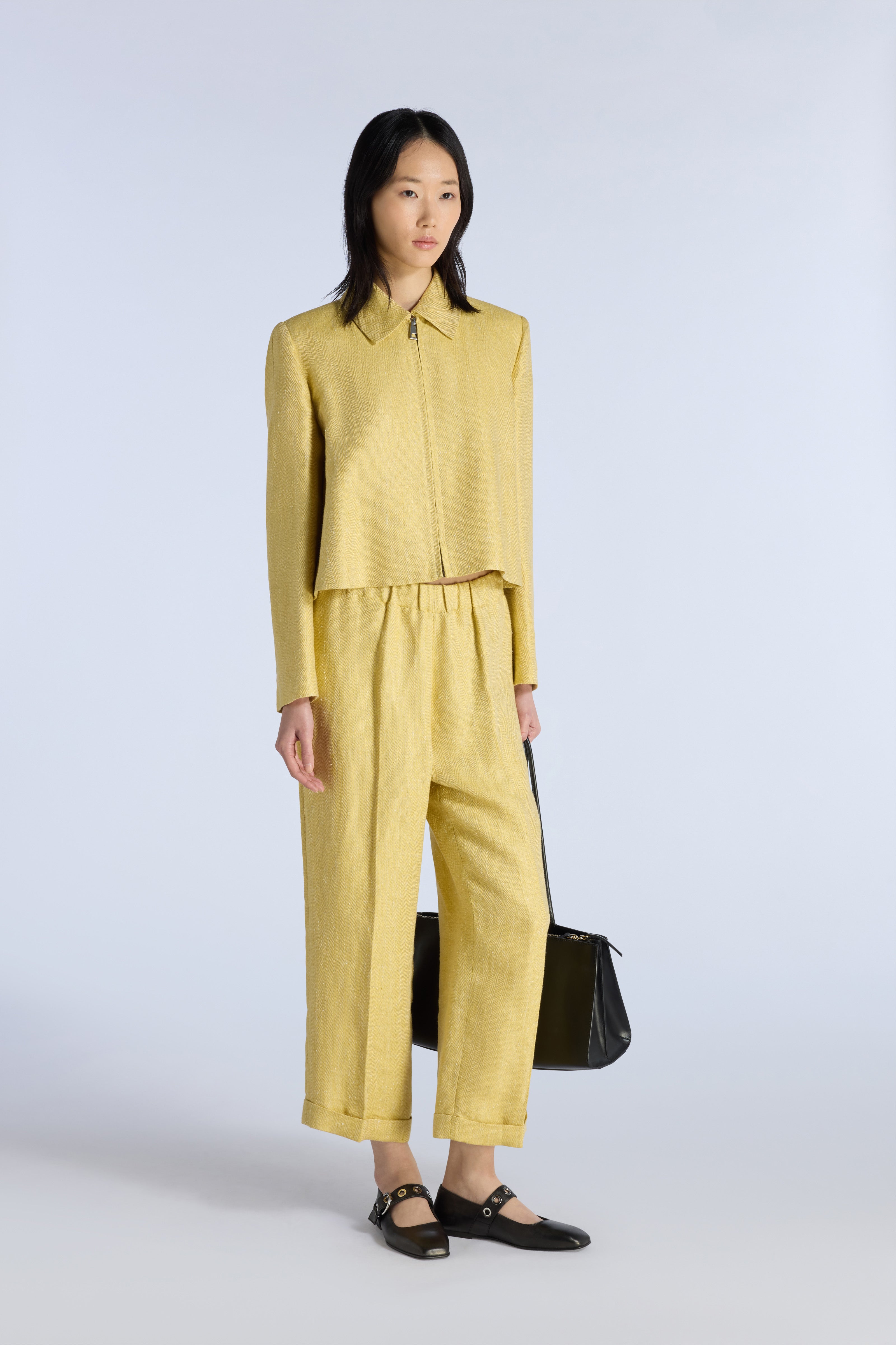 GIACCA IN SETA-LINO DISEGNO RESCA CON COLLO A CAMICIA, CHIUSURA CON ZIP CENTRALE E CURSORE IN METALLO ARGENTO. LINEA MORBIDA LEGGERMENTE CROP E AD A. MANICHE LUNGHE CHE COPRONO LEGGERMENTE I POLSI.
