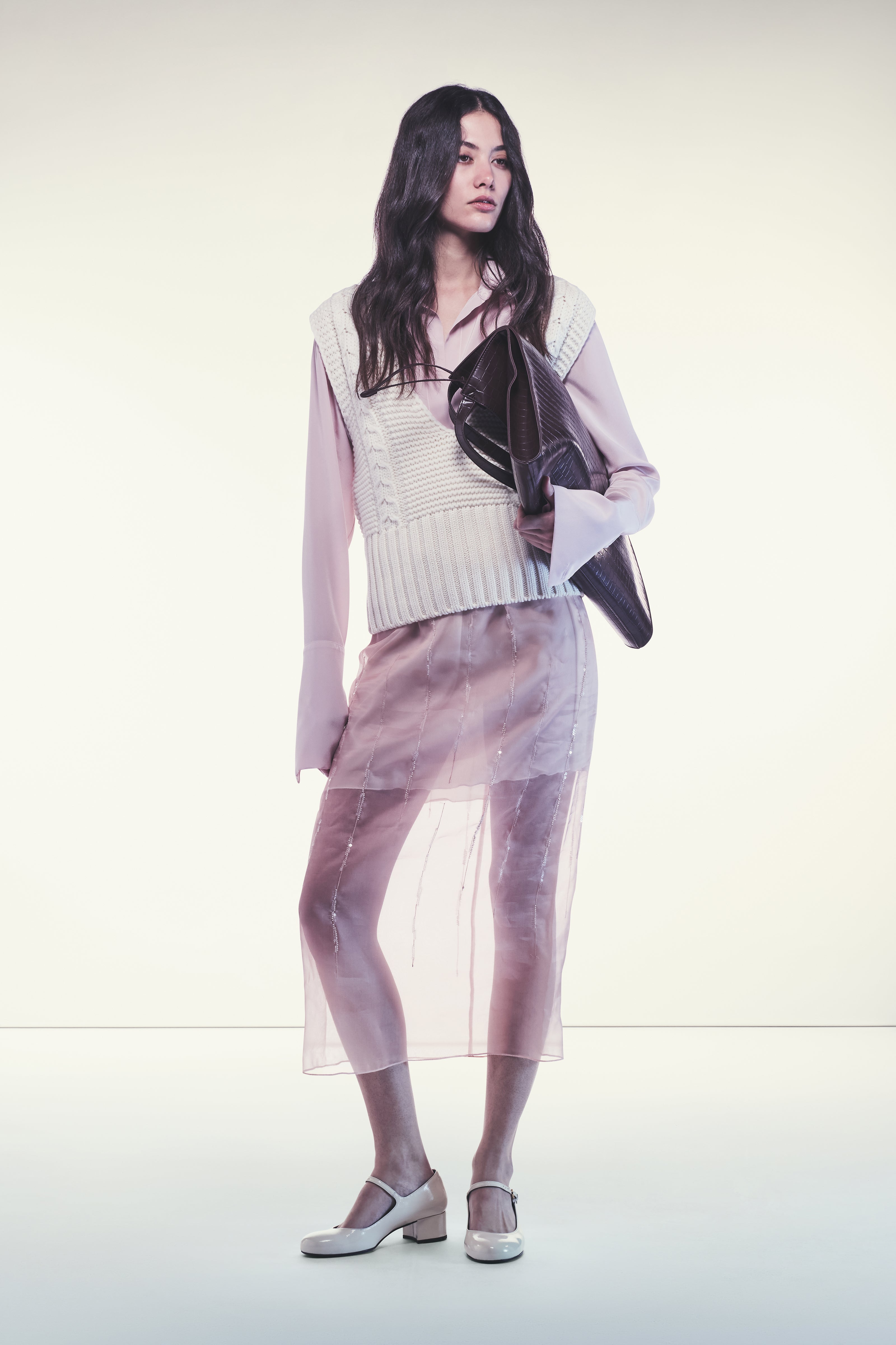 GILET SMANICATO IN FILATO DI LANA CON FINITURA DIP DYE. LA MAGLIA RASATA È ARRICCHITA DA INSERZIONI TRAFORATE TONO SU TONO. MODELLO CON SPALLE SCESE, SCOLLO A V PROFONDO E LINEA DRITTA. LUNGHEZZA AL PUNTO VITA, VESTIBILITÀ REGOLARE, FONDO RIFINITO CON UNAMPIA FASCIA A COSTE.
