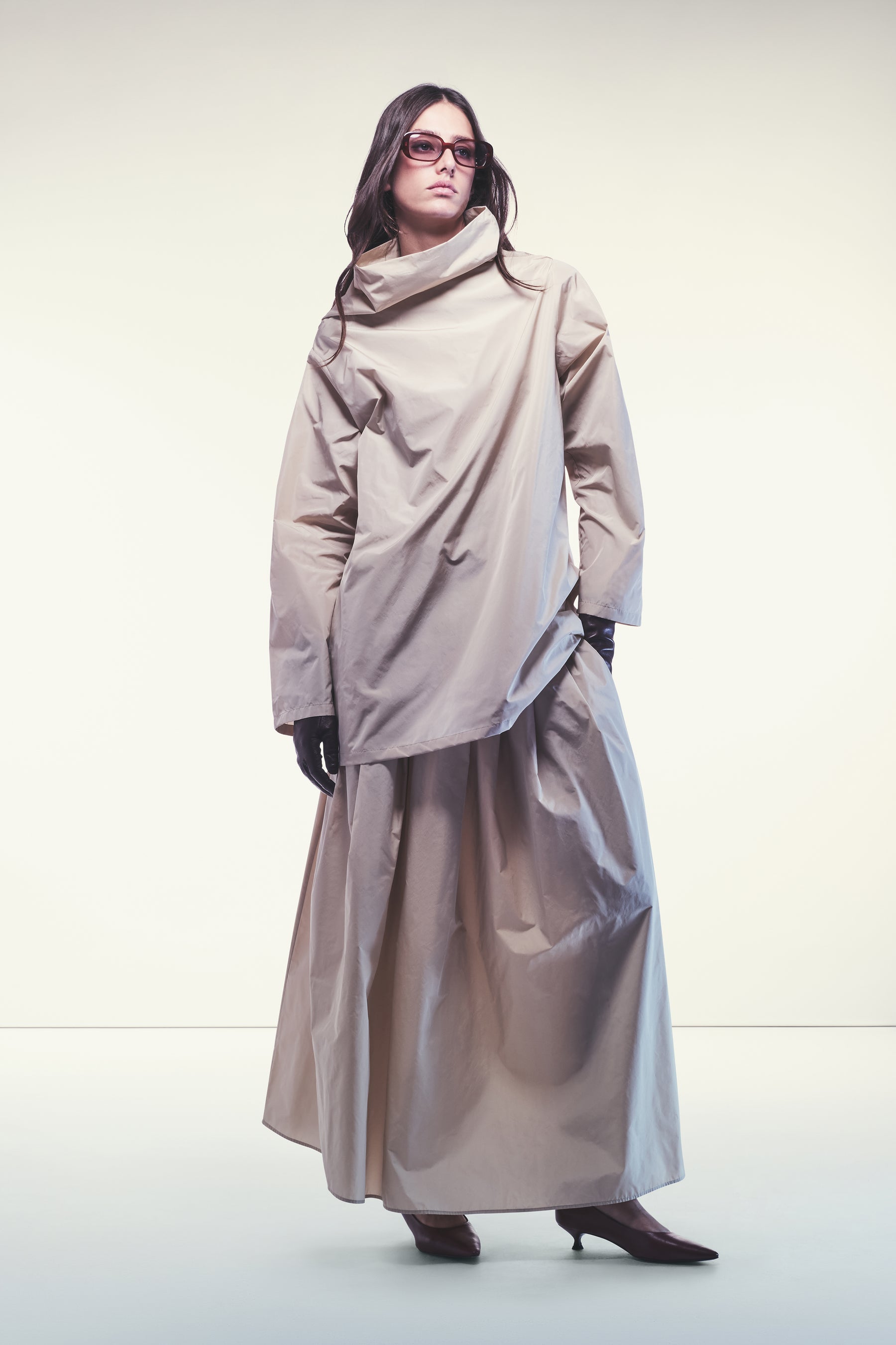 GONNA LUNGA IN TAFFETÀ, DAL TESSUTO RIGIDO E LEGGERMENTE LUCIDO CHE DONA STRUTTURA E UN ASPETTO ELEGANTE.